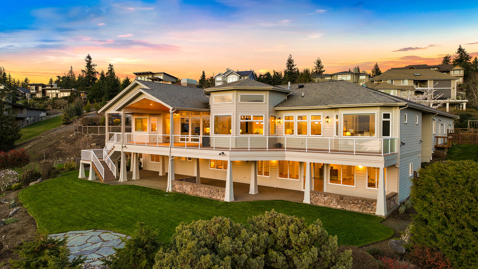 Enjoy forever, endless views of Bellingham Bay and the San Juan Islands from this custom-built home set on a private 3/4 acre lot in the highly coveted & sought after Samish Crest Highlands neighborhood. Three years ago, the owners vacated for a year and spent close to $900,000 dollars on a complete renovation creating the perfect balance between classic and fresh with a light, airy aesthetic incorporating rich design details and refined interiors. Enjoy walls of windows that flood over 6,000 square feet of living space with light & tranquility while the extensive 1,350 square feet of deck & covered patio provide unparalleled outdoor living spaces that are perfect for entertaining. A highly desirable main floor living plan with a chef's kitchen, butlers pantry, two primary suites & the perfect home office while the lower level, accessed by an elevator, has a large entertainment room and 3 additional bedrooms, 2 with baths. In addition, there is over 600 square feet of storage in the home and a large 900 square foot three-car garage. Nothing is missing in this one of a kind oasis, including beautifully manicured gardens and fruit trees. STUNNING & IRREPLACEABLE!