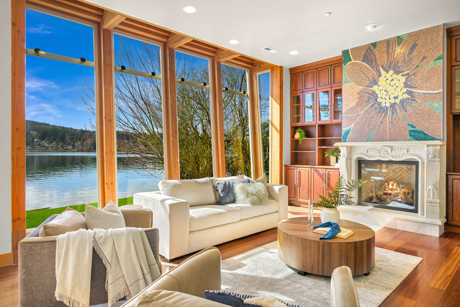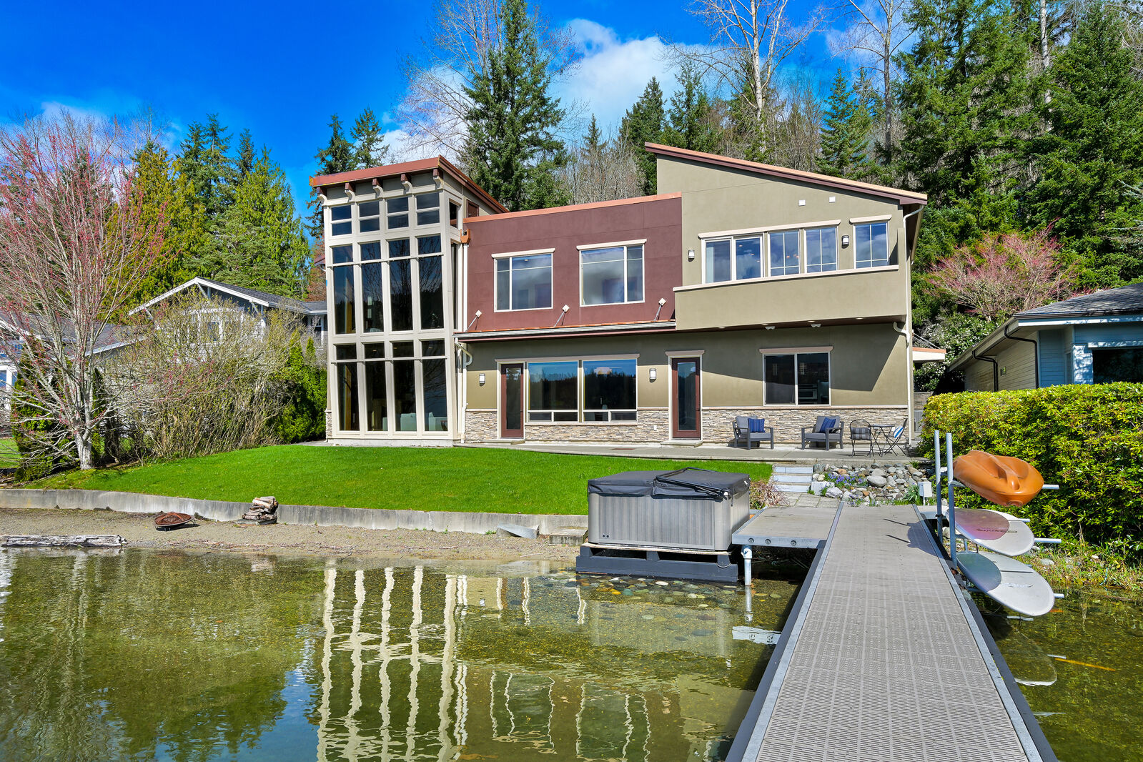 Experience rare beachfront lake living in desirable Dellesta Park, featuring a sandy shoreline, mature trees for exceptional privacy, and premium south-facing exposure for all-day sun. This custom-built, first-time-on-the-market home offers a fantastic floorplan with 4,200+ square feet, 5 bedrooms, a den and multiple living spaces, enhanced by dramatic floor-to-ceiling glass capturing expansive water views and breathtaking sunsets. Level, newly landscaped yard with bulkhead, beach, and an extended dock. Recent upgrades include a new hot tub set to capture the starry nights, newer roof, dual heating/AC units, plus kitchen and bath updates. Timeless craftsmanship shines throughout with Brazilian cherry floors, Italian-imported granite, marble mosaic art, and high-end cabinetry. Make this summer unforgettable on beautiful Lake Whatcom!