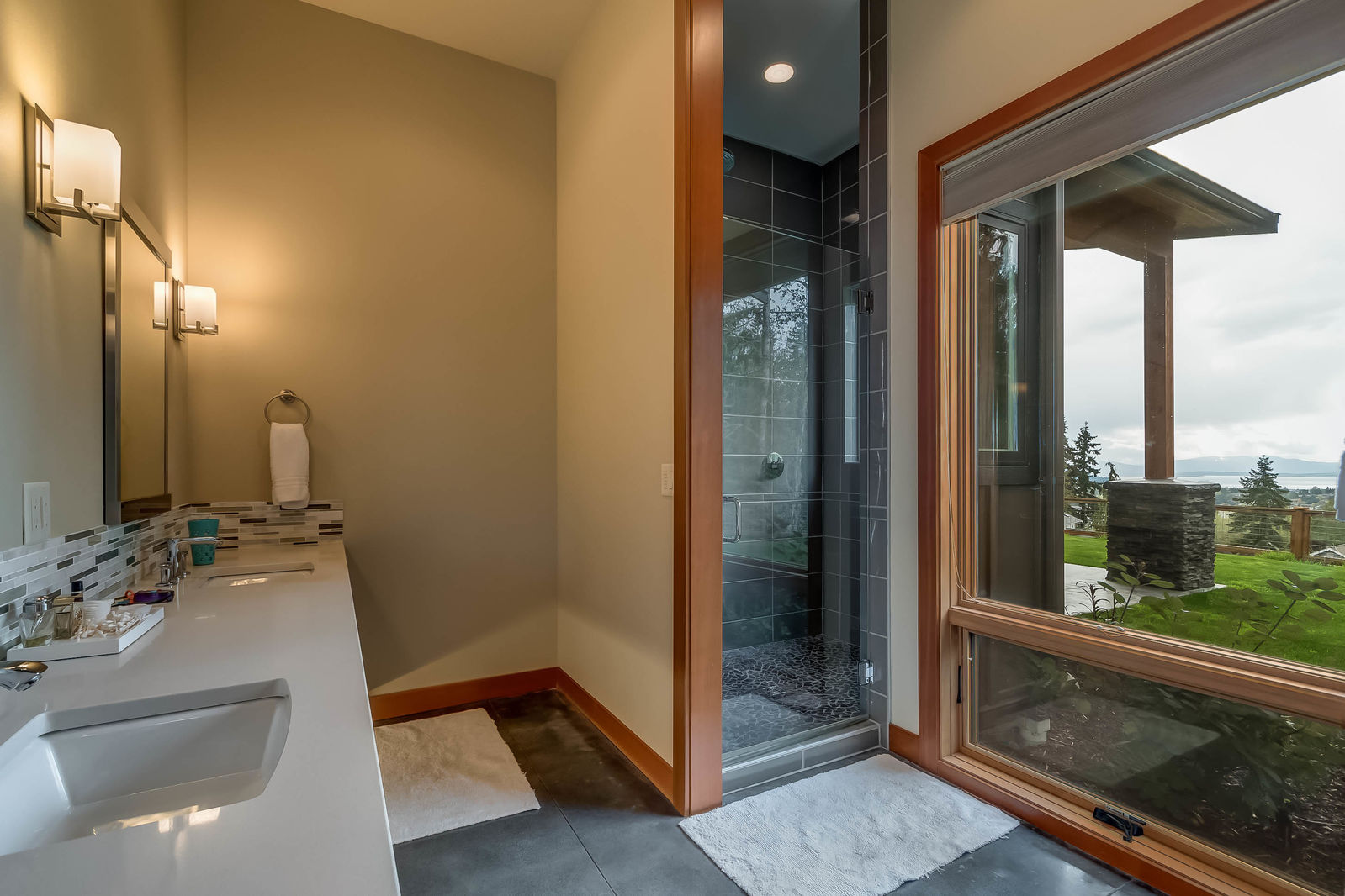 Unparalleled views over looking the city, lake, Bay and San Juan islands! Architecturally designed 3,836 square foot, one-level for causal living and artfully constructed with no expense spared or detail left out. Situated on private lane on 1.64 picturesque acres offering privacy yet only minutes from town. Features include: 1,260 sq/ft 3-car garage/shop, over 1,000 sq/ft of patio, radiant floor heat, polished concrete floors and commercial grade kitchen with custom cabinetry. Stunning NW custom!